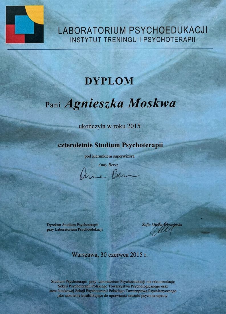 PSYCHOTERAPEUTKA w trakcie certyfikacji w Polskim Towarzystwie Psychologicznym - PTP. Ukończone 4 letnie szkolenie akredytowane przez PTP w Laboratorium Psychoedukacji w Warszawie (certyfikat). Ukończona 2 letnia Szkoła Psychoterapii Par i Rodzin w Laboratorium Psychoedukacji. (certyfikat)