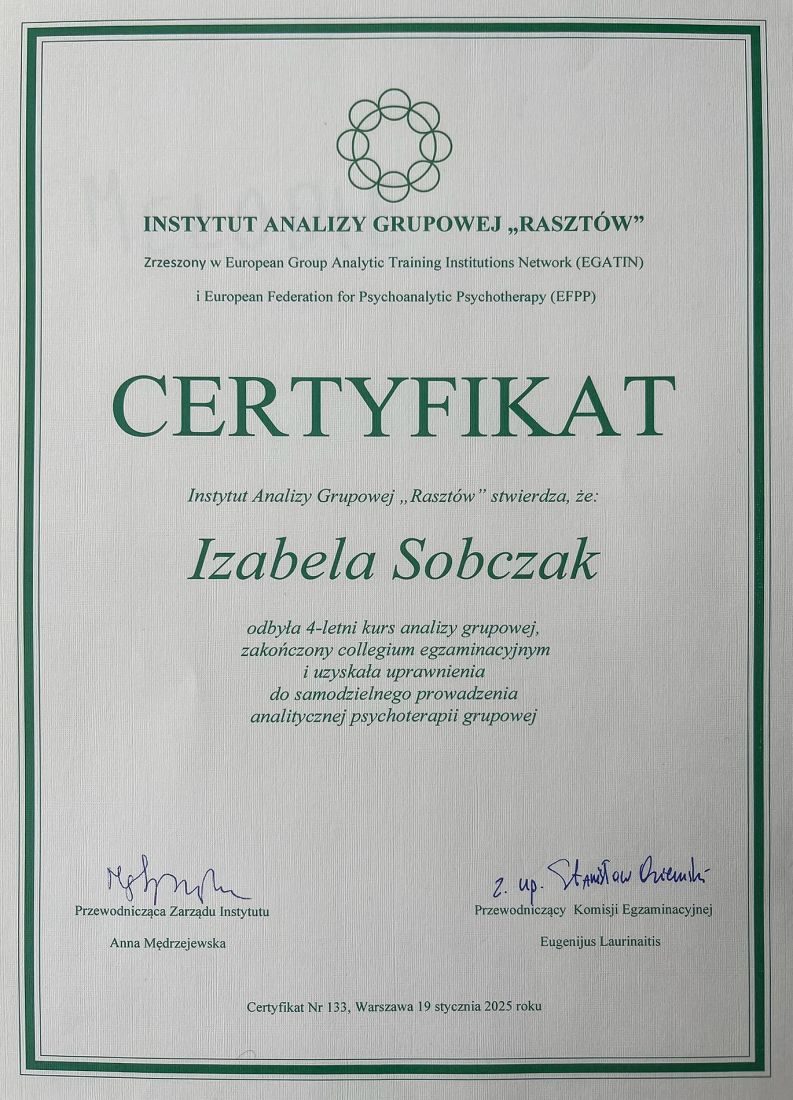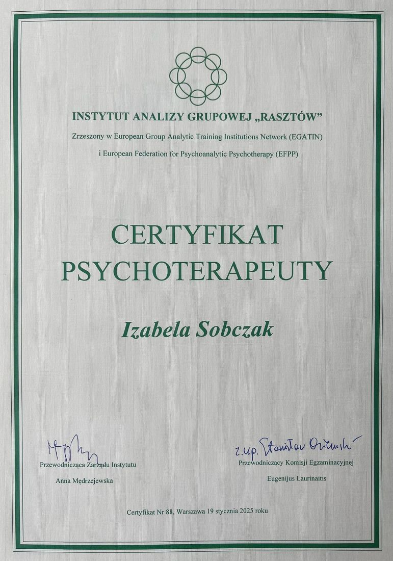 Certyfikaty numer: 88 z zakresu psychoterapii indywidualnej (certyfikat) oraz 133 z analitycznej terapii grupowej (certyfikat)