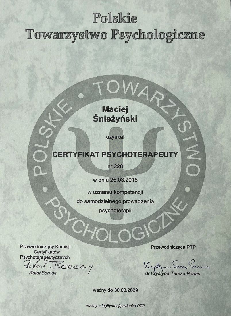 PSYCHOTERAPEUTA Certyfikat numer 228 Polskiego Towarzystwa Psychologicznego – PTP (certyfikat)